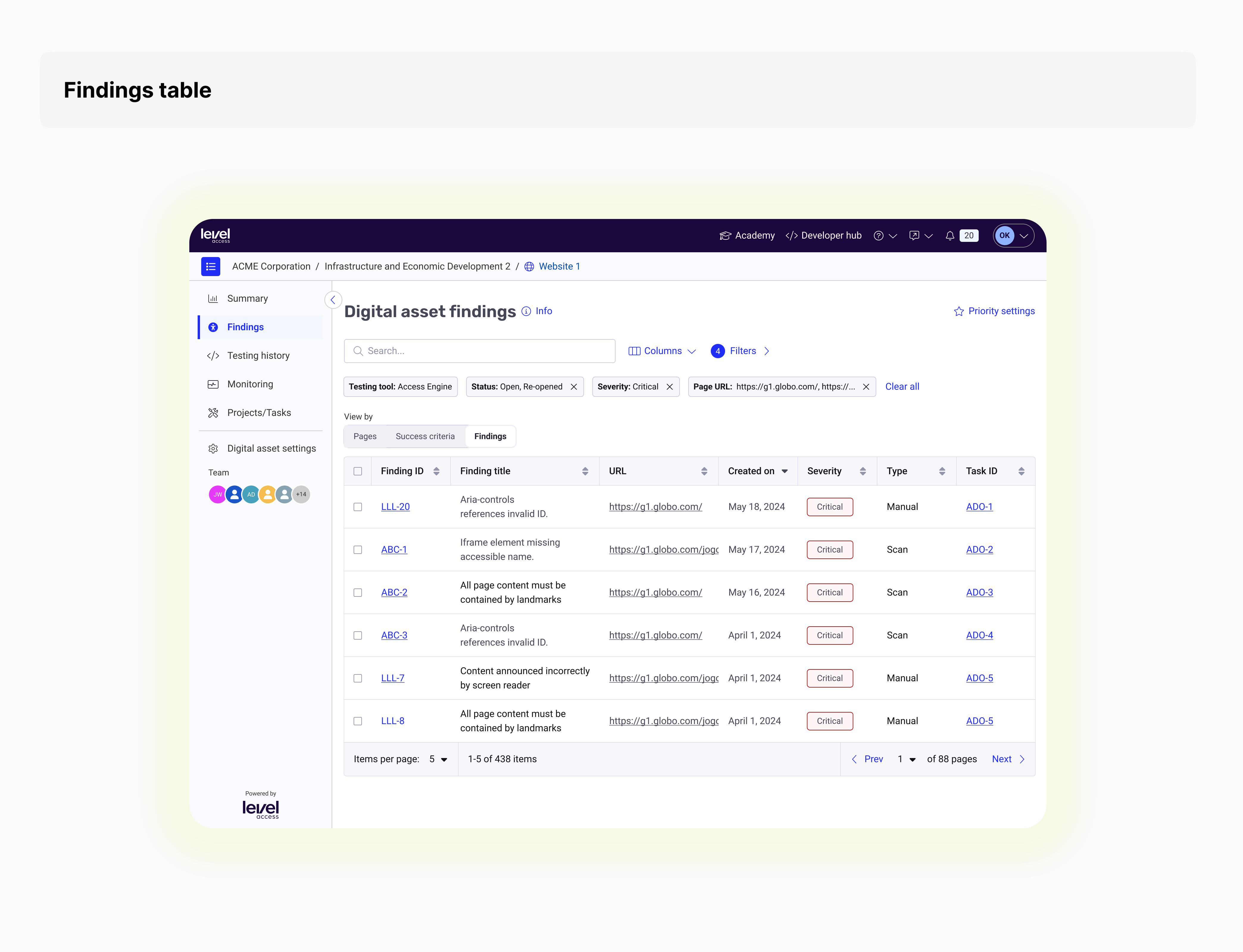 We envisioned a new experience: Digital Asset Findings, a single, centralized space where teams could view, filter, assign, and resolve accessibility findings in real time.